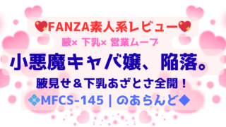 MFCS-145「小悪魔キャバ嬢のあらんど◆」のレビュー。腋見せ・下乳あざとさ全開のキャバ嬢が、営業ムーブから気持ち良さに溺れる瞬間が魅力の一本。MOON FORCE 2ndらしい体験型ハメ撮りで中出し二連戦も収録。
